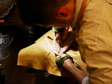 お客さまに合わせた木型を元に製作した仮靴を履いていただき、フィッティングをチェックしていきます。